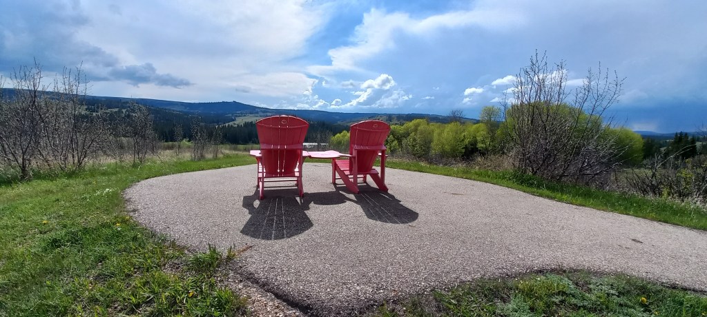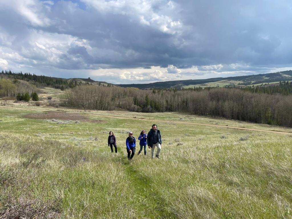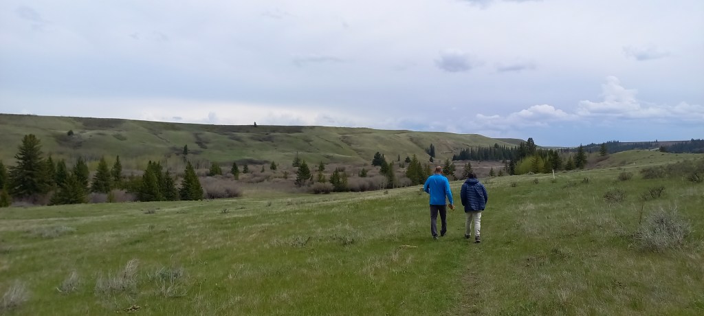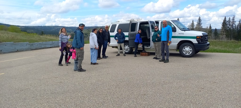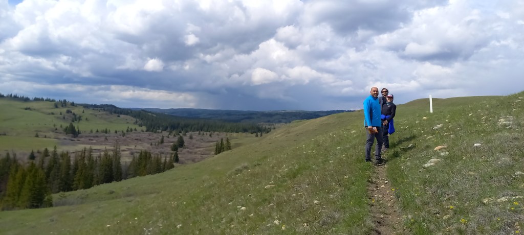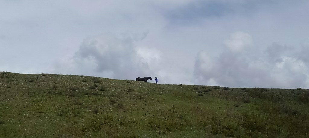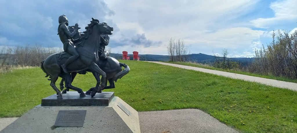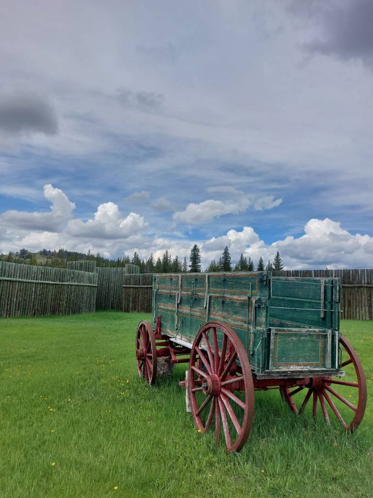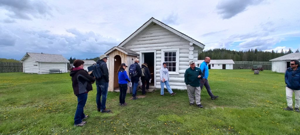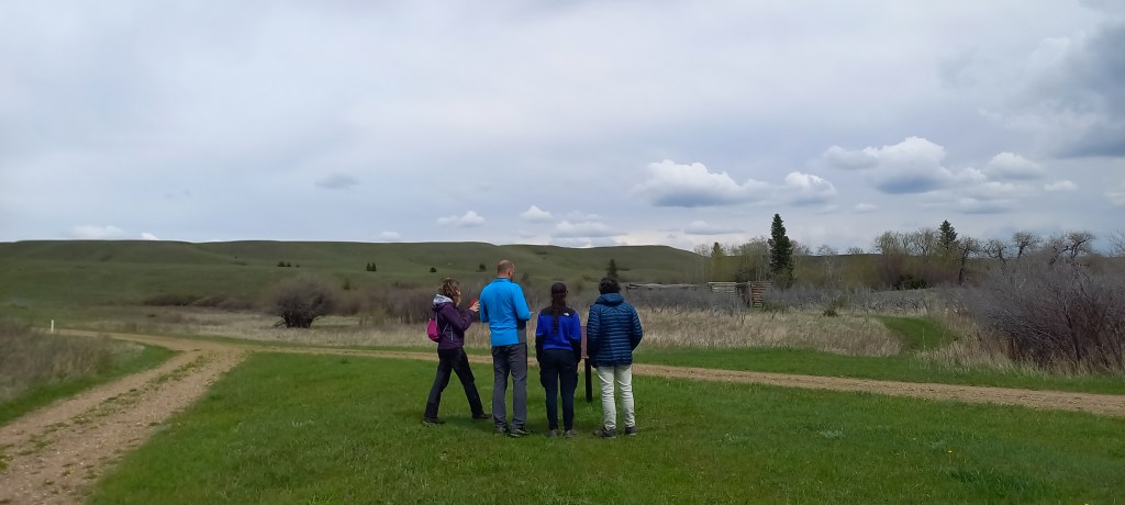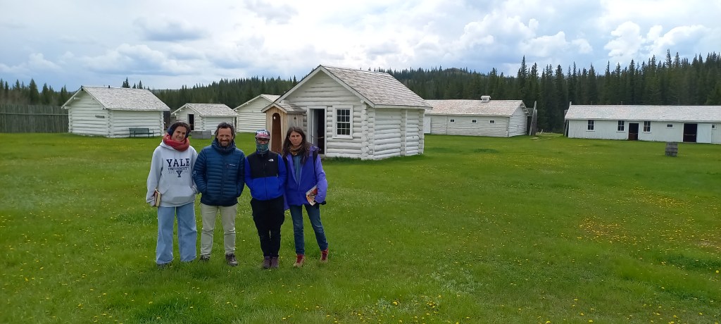 Després de la visita guiada al fort, hi ha ganes de caminar per la zona. El paisatge és molt diferent del que hem vist a les Rockies i a les planúries d’Alberta. Arribats a aquest punt, fem dos equips. La meitat del grup torna al centre d’interpretació i l’altra meitat del grup recorrem l’itinerari proposat per a descobrir els voltants del fort. Turons suaus coberts d’un mosaic de prat verd, rierols, boscos de fulla caduca i boscos de pins. Feia temps que no veiem aquest paisatge. El cel canviant, tan bon punt mostra un sol radiant com es cobreix de núvols grisos. Ens plovisqueja de tant en tant. Poca cosa. Estem de sort, perquè cap de nosaltres porta res per a protegir-nos de la pluja. La caminada val la pena. L’Ona acaba fent amistat “de per vida” amb un dels cavalls que pastura per allí. Arribem contents al centre d’interpretació.