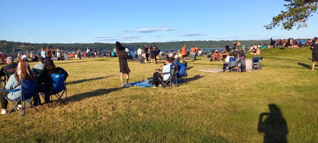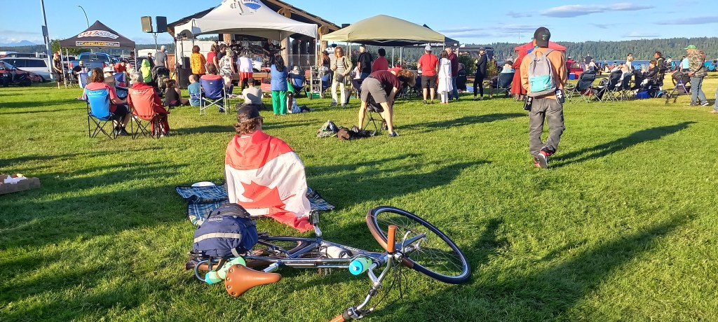 Arribem a Campbell River a mitja tarda, després de creuar-nos Vancouver Island d’oest a est, costa a costa. És un poble de costa més o menys gran des d’on hem d’agafar el ferri cap a Quadra Island. Al costat de la terminal des d’on s’agafa el ferri estan celebrant el Canada Day. Com que encara tenim una estona abans no surti el pròxim vaixell, decidim passejar-nos entre la multitud. Cadires de càmping, mantetes de pícnic, cotó de sucre, hot dogs, música en viu i banderes del Canadà. Tot molt autèntic. Comprem alguna cosa per entretenir la gana i ens instal·lem entre la multitud per a veure passar la tarda. Amb un altre estil, diferent del d’Alberta, continuem estant al Canadà profund.
