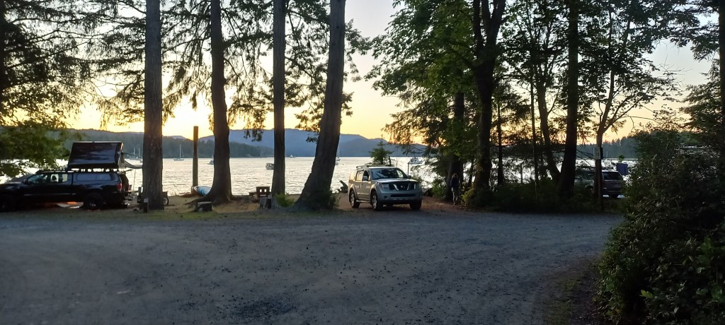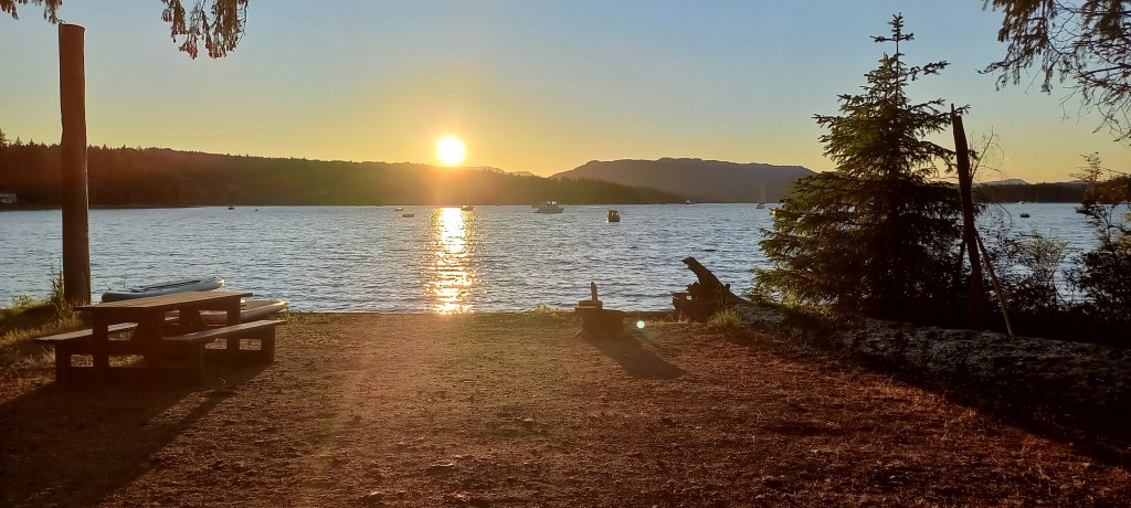 El ferri ens porta a Quadra Island en menys de 15 minuts. L’illa és més aviat petita i ja sols arribar-hi, veiem que el ritme és pausat i relaxat. Arribem al càmping amb el sol ben baix, reflectint-se sobre la badia, just davant de les parcel·les. El lloc és increïble. Demà sortirem a explorar l’illa.