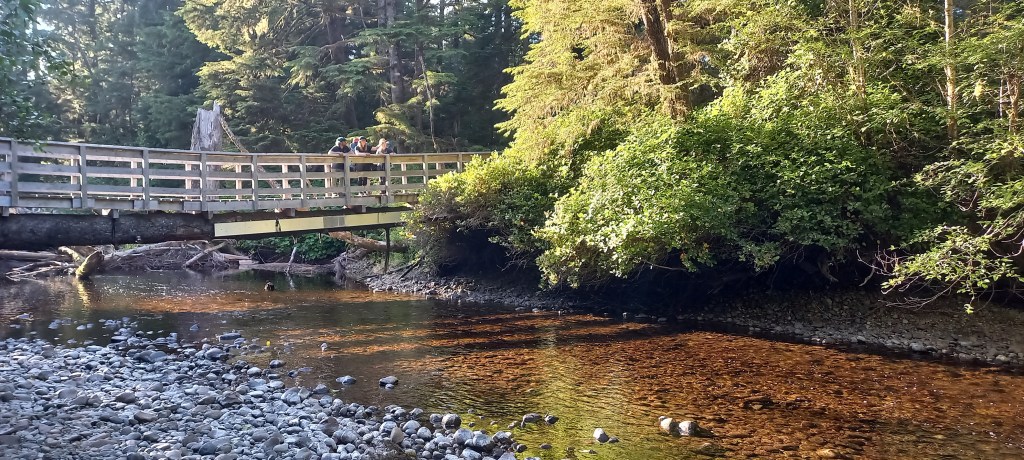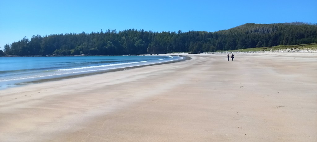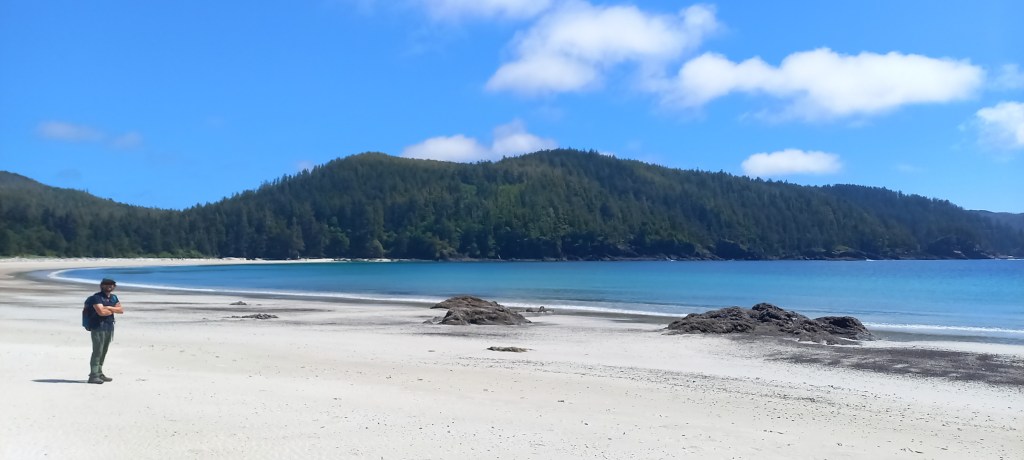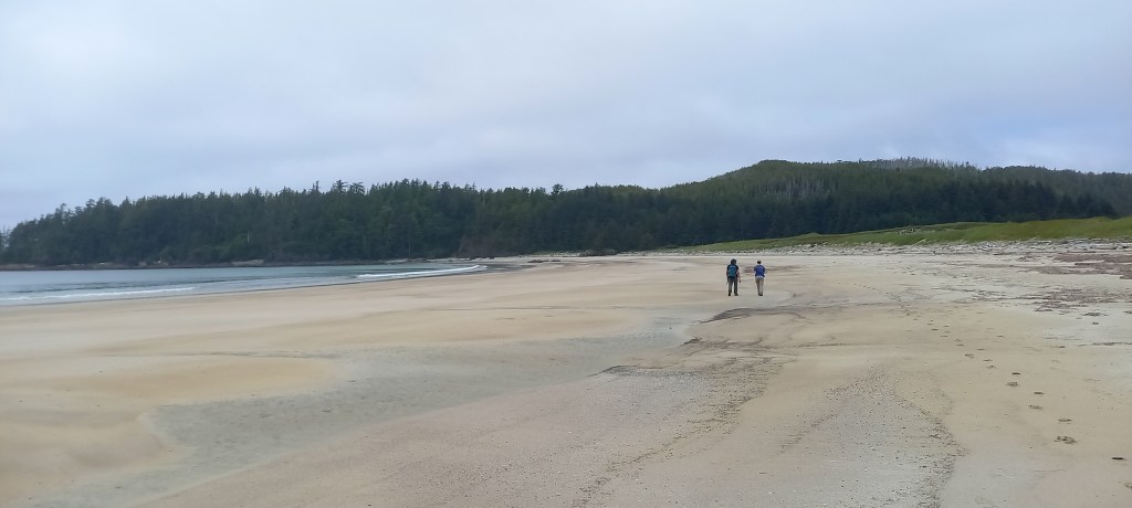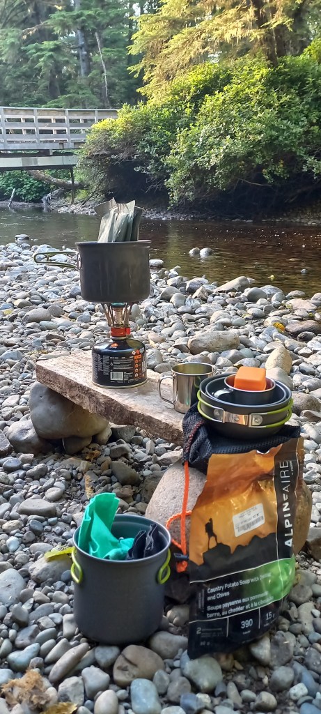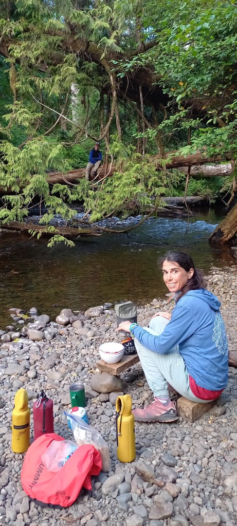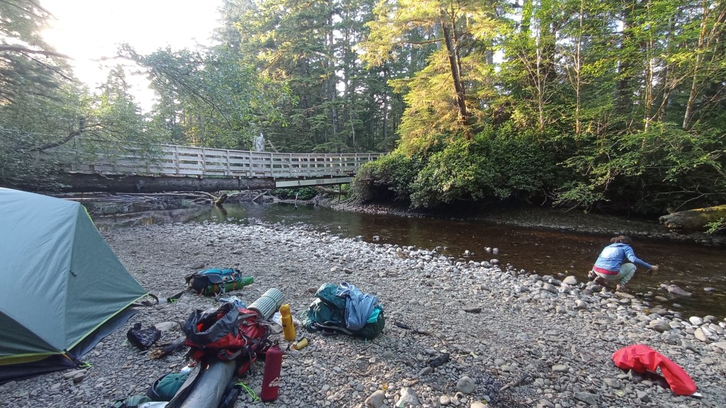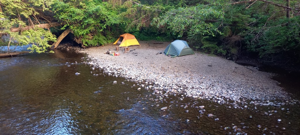 Es veu que mitja British Columbia està en flames, tot i que aquí no ho sembli, així que hi ha un decret en l’àmbit provincial que prohibeix fer foc en qualsevol indret, i ens impedeix, tot i la humitat present a tot arreu fer un foc a terra que hagués fet el campament encara més perfecte. De totes maneres estem tots força cansats, i poc després de sopar i amb el sol encara resistint-se per marxar agafem el camí cap a les tendes.