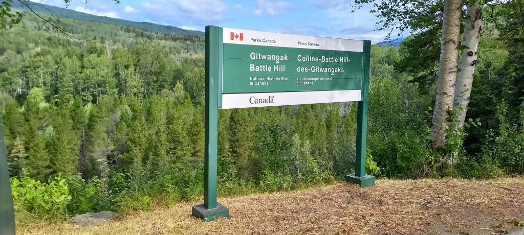 Comencem avui la ruta per la Highway 37 des del centre de British Columbia fins el Yukon. La primera parada la fem a Gitwangak Battle Hill site, molt a prop del càmping. Avui en dia sols es veu un petit turó que s’alça just al costat de la carretera. Els plafons informatius expliquen que dalt d’aquest turó hi havia cinc habitatges envoltats d’un mur de fusta. Data de finals del s. XVIII, molt abans que els colons europeus arribessin a la zona. Sembla que eren un poble guerrer i que el cap de la tribu era un veritable busca-raons. Va morir en una batalla contra algun dels pobles veïns. Un cop mort, els veïns van cremar el poble del turó i van viure força més tranquils. És el primer poble de First Nations fortificat que veig al Canadà, bé, el que en queda.