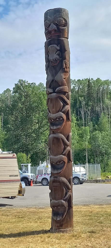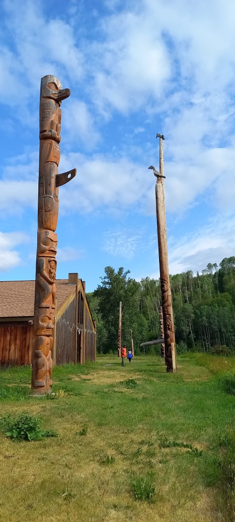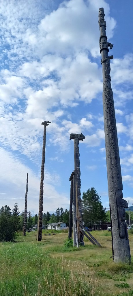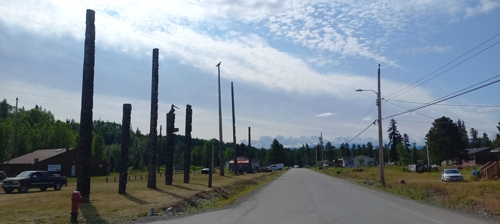 El poble de Gitanyow queda uns quilòmetres més enllà. El poble en si és poc més que una benzinera amb botiga al costat d’un centre d’interpretació arran de carretera. La població viu escampada per la zona en cases més aviat remotes, com la majoria dels pobles del nord de BC. El que té d’especial Gitanyow és l’enorme col·lecció de tòtems superxulos plantats arreu. El centre d’interpretació està tancat sense més explicació. Llàstima! Contemplem els tòtems del voltant i continuem fent ruta.