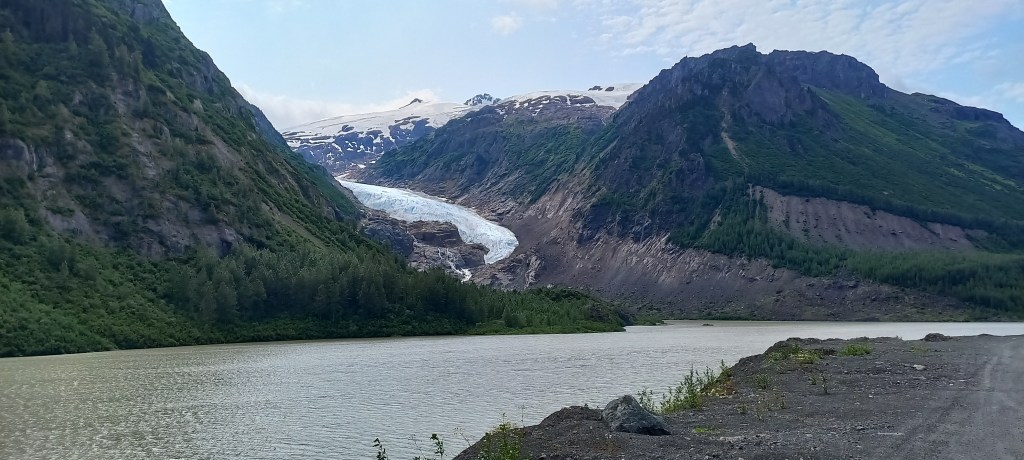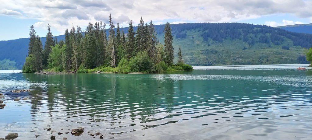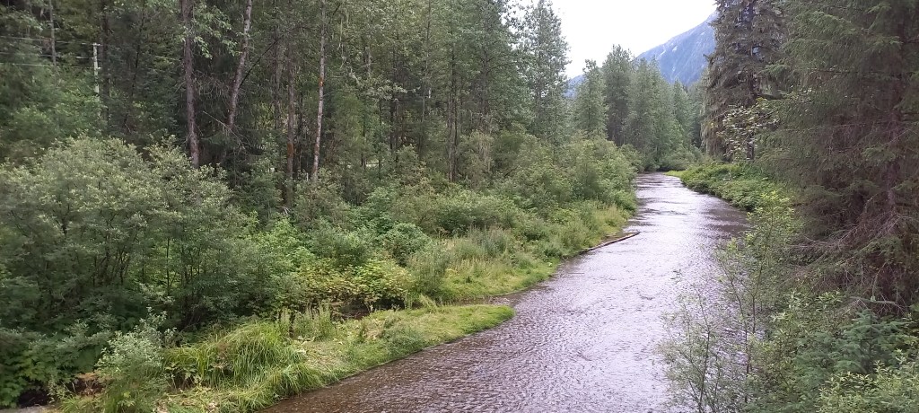Ja a la tarda arribem a Meziadin Lake. És preciós. L’aigua d’un blau intens contrasta amb els arbres que l’envolten. Ens cruspim el pícnic contemplant el llac. Prop del llac hi ha una estructura construïda per ajudar els salmons a remuntar el riu Meziadin. És un bon lloc per a veure saltar els salmons. No ho havia vist mai. És tot un espectacle. A la guia posa que també és freqüent veure els grizzlies pescar, però avui no tenim sort.