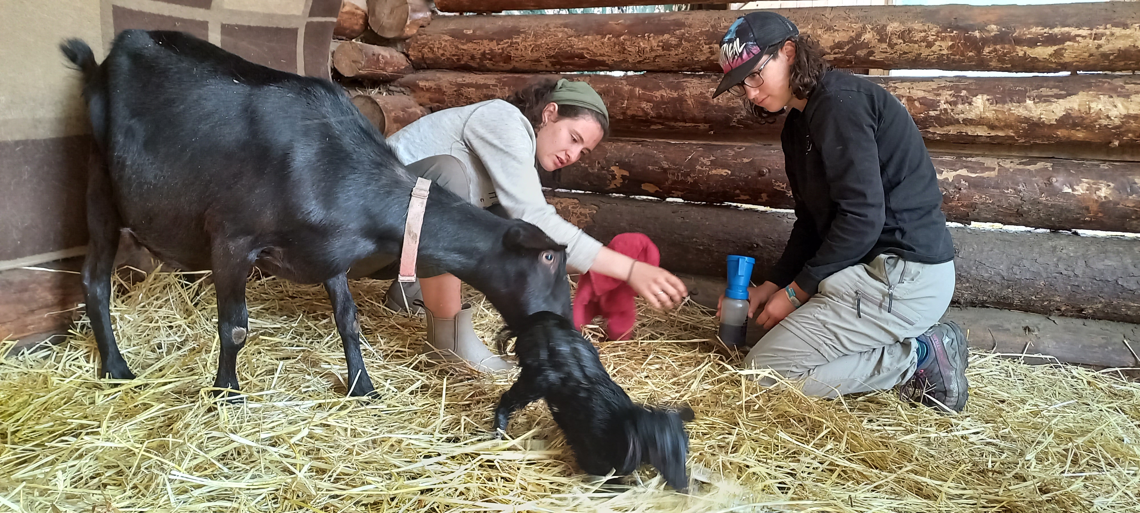 Volem passar dues setmanes a Sunny Spot Farm. En Dani ha de treballar durant aquestes dues setmanes de dilluns a divendres. Seguint l’horari que tenia a Calgary, s’aixeca ben d’hora i es connecta a l’ordinador estratègicament posat a un racó del menjador. Al cap d’un parell o tres d’hores començo jo el dia esmorzant amb ell. Quan la resta de voluntaris comencen a circular per la casa, en Dani ja ha treballat durant mitja jornada. La veritat és que tots els voluntaris s’ho prenen amb calma i el dia a la granja comença ben bé a mig matí. Cada dia hem de posar menjar i aigua a les cabres i netejar els corrals. Si som colla i fem prou via, podem dedicar una estona a fer altres feines com construir un cobert per les cabres o tallar fusta. L’Ona i jo agafem ràpid el ritme. Aprenem les feines de la granja i un munt de coses sobre les cabres. La feina no és dura i gaudim del dia a dia. Són dies de descans relatiu. Aprenem a munyir cabres, a alimentar-les, a cuinar per a dotze persones …, La vida a la granja és molt tranquil·la. També gaudim d’aquest ritme pausat i contemplatiu. Quan comencen a néixer els cabrits és molt emocionant. Em meravella com al cap de pocs minuts ja es posen drets i comencen a caminar. Les cabres són animals amb molta curiositat i als cabrits els encanta interaccionar amb la resta de congèneres i també amb els humans. A l’Ona i a mi ens falten mans per a poder fer moixaines a tots els nouvinguts! Anar a saludar als cabrits abans d’anar a dormir acaba essent un dels rituals diaris.